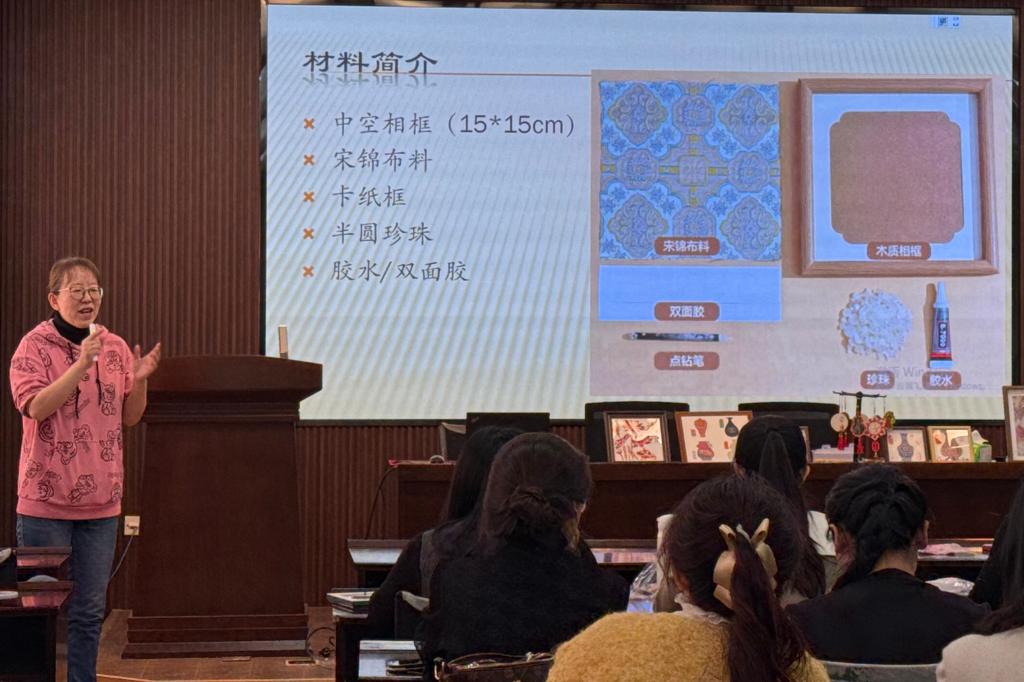 活动伊始,张方老师从周敦颐的《爱莲说》切入,为大家详细介绍了宋锦的历史渊源与工艺特点,并现场演示了珍珠画的创作技巧。她重点讲解了莲花“出淤泥而不染”的象征意义,让师生们在感受传统文化魅力的过程中,潜移默化地接受廉洁文化的熏陶。