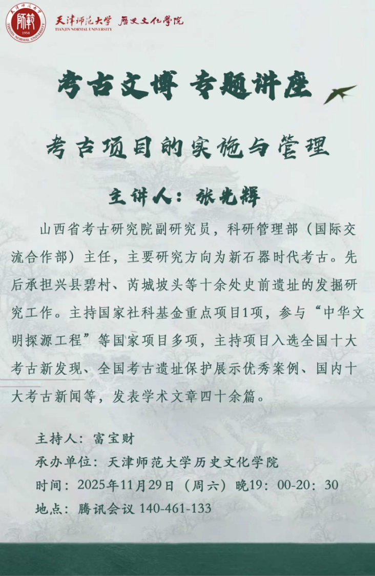 11月29日晚19:00,山西省考古研究院张光辉老师为文博专业师生带来第三场题为《考古项目实施与管理》的讲座。
