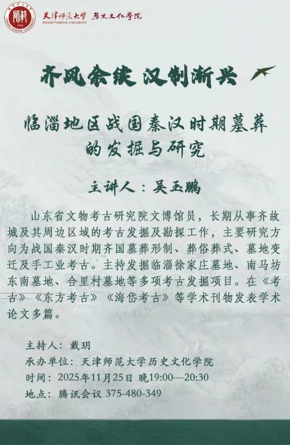 11月25日晚19:00,山东省文物考古研究院吴玉鹏老师以“齐风余续,汉制渐兴——临淄地区战国秦汉时期墓葬的发掘与研究”为题,做了首场线上讲座。