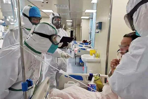 (张伯礼(左前)弯腰诊察新冠肺炎患者情况)