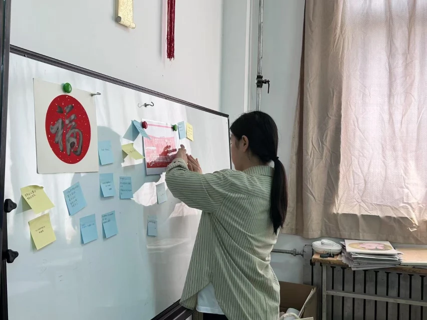 活动伊始,同学们先在便签纸上写下柔软的话语,或是鼓励未来的自己,或是激励身边的同伴,一张纸不同颜色的便签纸贴上黑板,纸页轻扬。八款师大特色印章整齐排列在长桌一端,“风”“清”“气”“正”的图文,“天行健,君子以自强不息”的警言……皆被浓缩在一方方印面之上。参与者或是摊开自带的集章册,或是领取准备的素白明信片,俯身轻按印章,油墨的清香与纸页的触感交织成独特的仪式感,集满八枚印记的明信片成为流动的校史小卷,让这份校园记忆又多了份可触碰的质感。现场氛围轻松活跃,同学们相互交流印章背后的校园故事,方寸印章成为连接校园记忆的纽带。