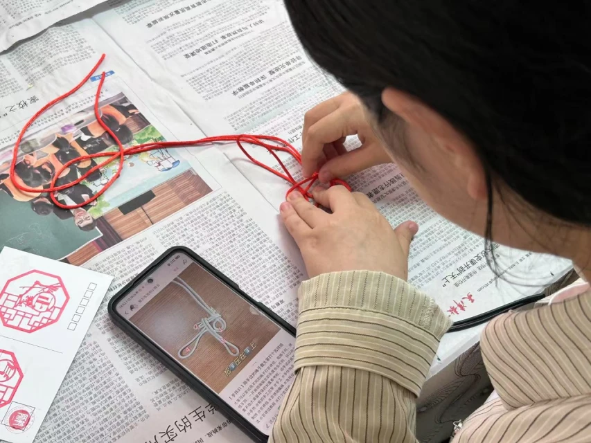 活动另一核心环节为中国结编织与折纸教学。教室另一侧,中国结的彩绳与折纸的彩纸在桌面铺展开来。编织中国结时,参与者们根据示范视频拆解步骤,“先将绳头绕成圈,右压左、下穿上,收紧时注意保持纹路平整……”红绳在指尖穿梭,化作一枚枚精致漂亮的结饰。折纸区则呈现出又一番景象。彩纸在指尖折叠、翻转,诞生了立体的千纸鹤、盛开的纸玫瑰……阳光掠过纸艺作品,在地面投下灵动的影子,与桌角摇曳的中国结相映成趣。参与者的思绪随着指尖的动作逐渐沉淀,享受难得的“心流”体验,整个教室弥漫着专注的气息,唯有指尖与材料接触的窸窣声,宛如时光的轻吟。